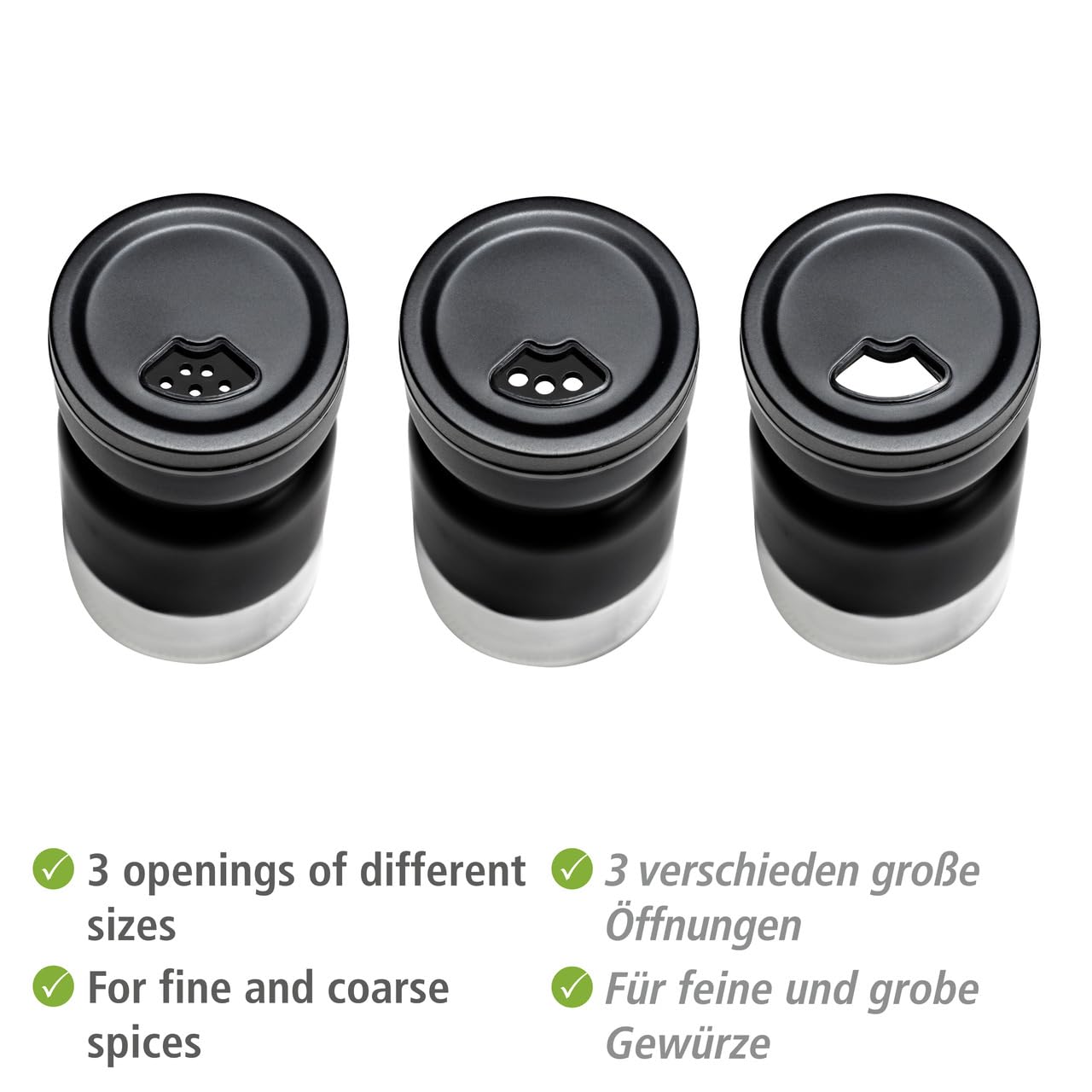 ✅ Różnorodność: pojemniki na: Różnorodność: pojemniki na przyprawy dzięki 3 różnym rozmiarom nadają się do prawie każdej przyprawy, zarówno gruboziarnistej, jak i drobnoziarnistej. Dzięki temu ziarna pieprzu, płatki chili, gruba sól morska lub drobna sól stołowa znajdą uporządkowane miejsce na stole lub w regale z przyprawami.