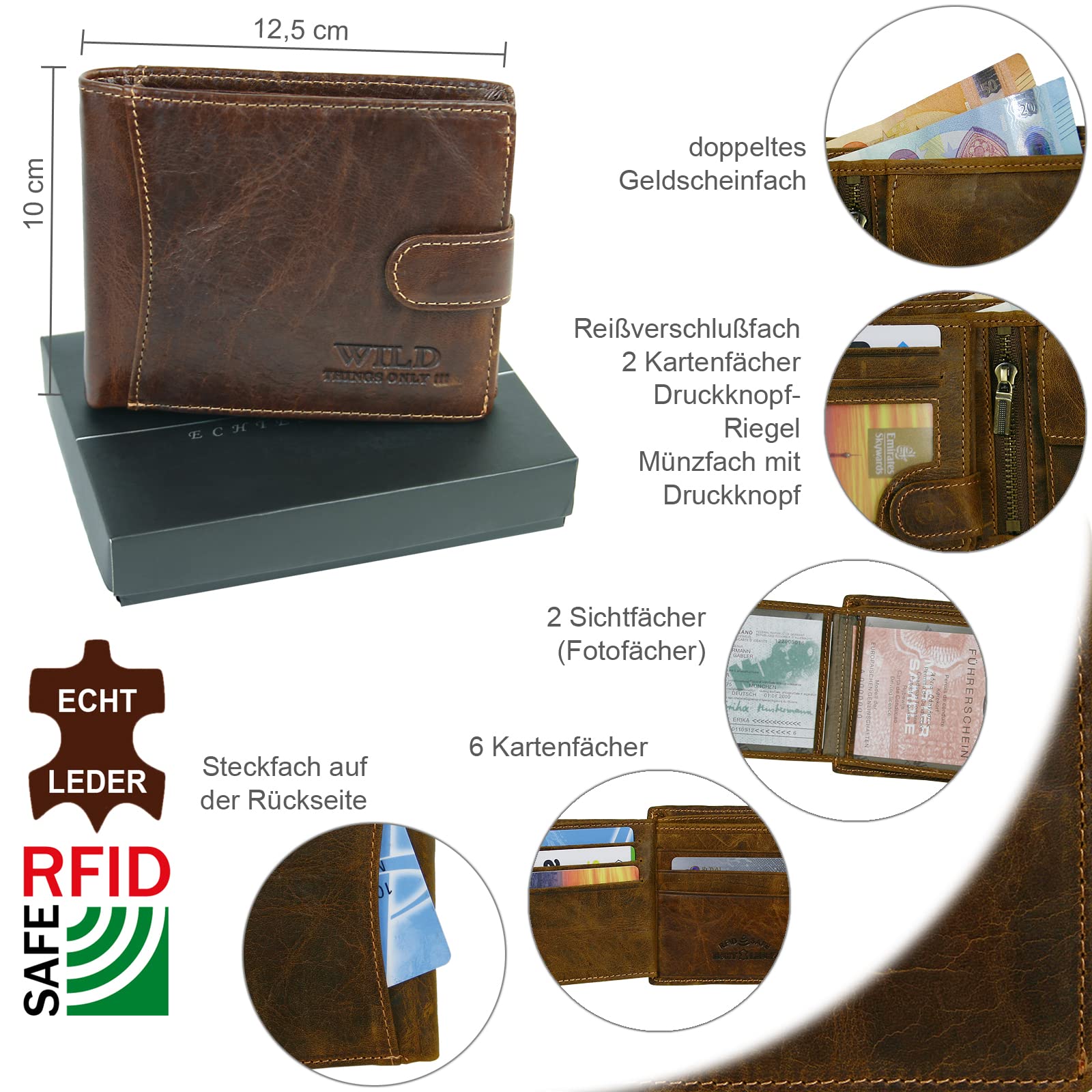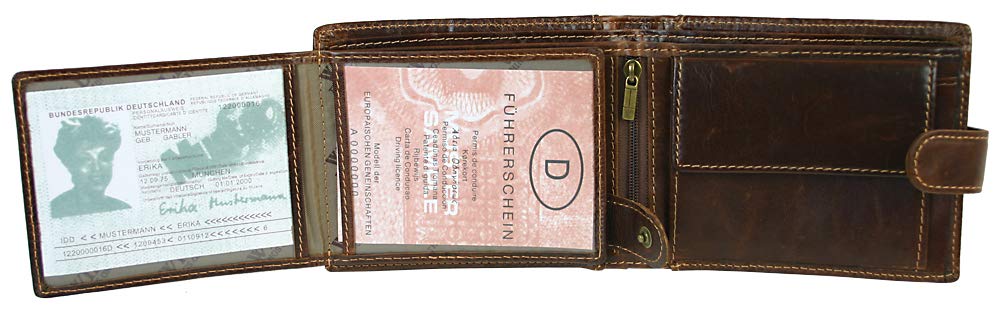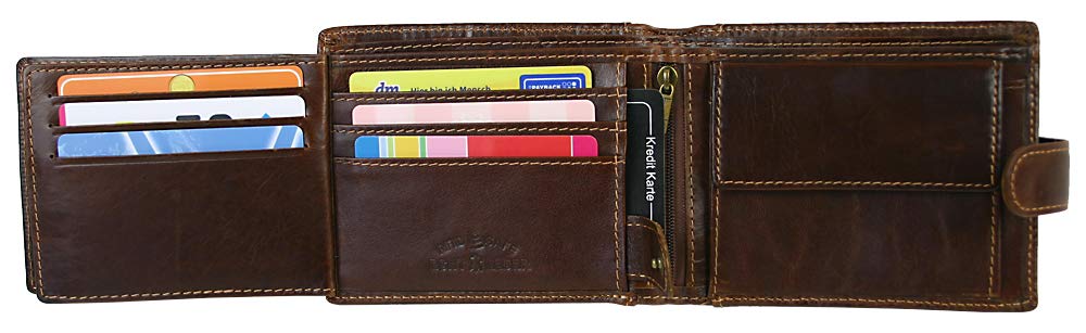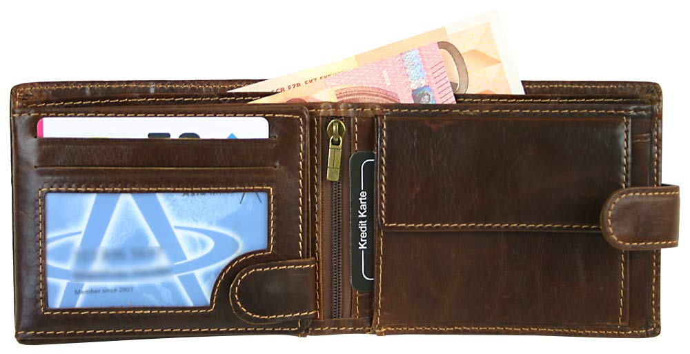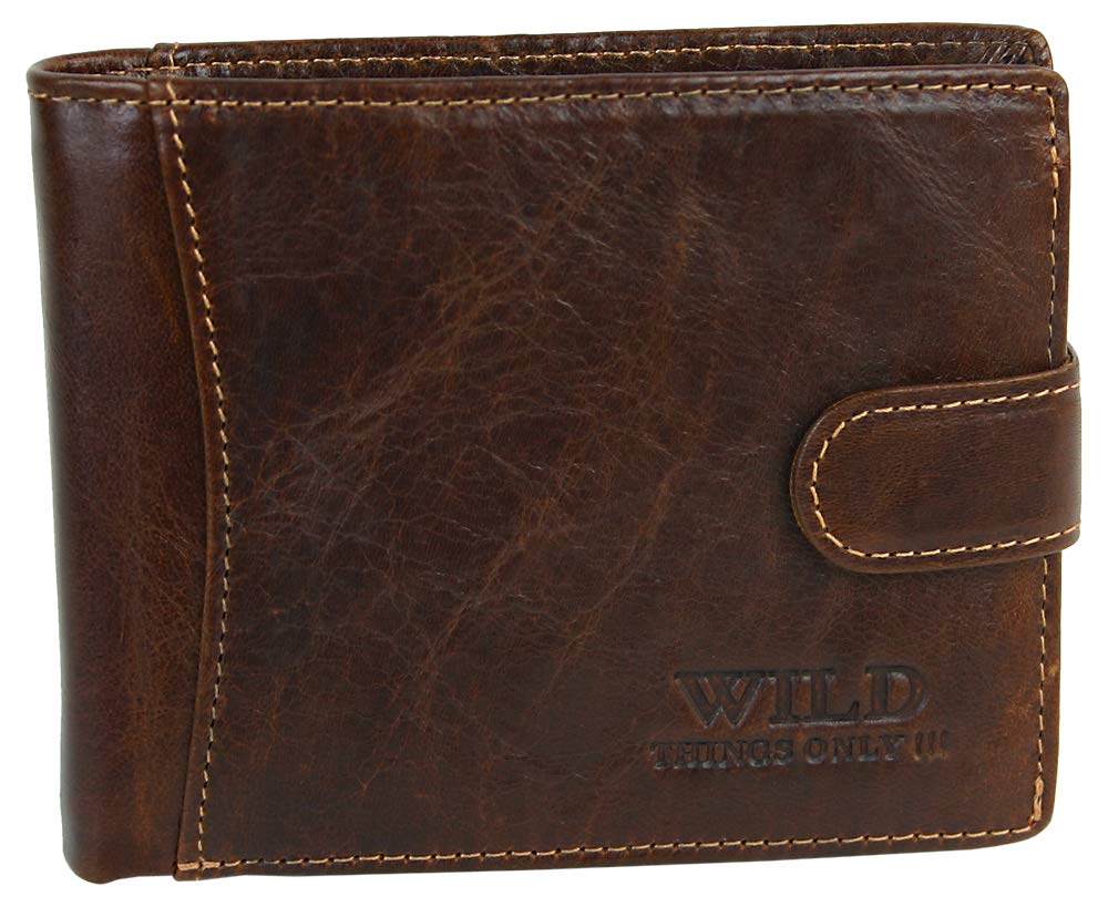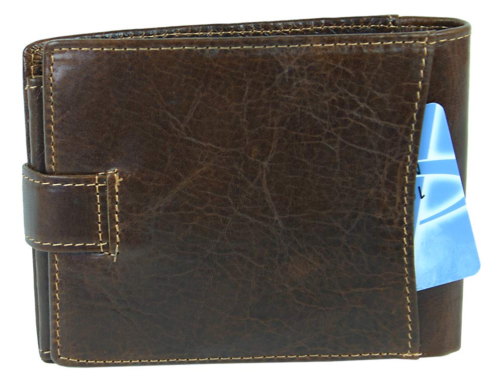 Męski skórzany portfel: Męski skórzany portfel z zatrzaskiem na zatrzask z ochroną RFID dla bezpieczeństwa Twoich danych przed odczytem. Rozmiar portfela: 12,5 cm x 9,5 cm x 2,5 cm. Dostawa w praktycznym pudełku prezentowym