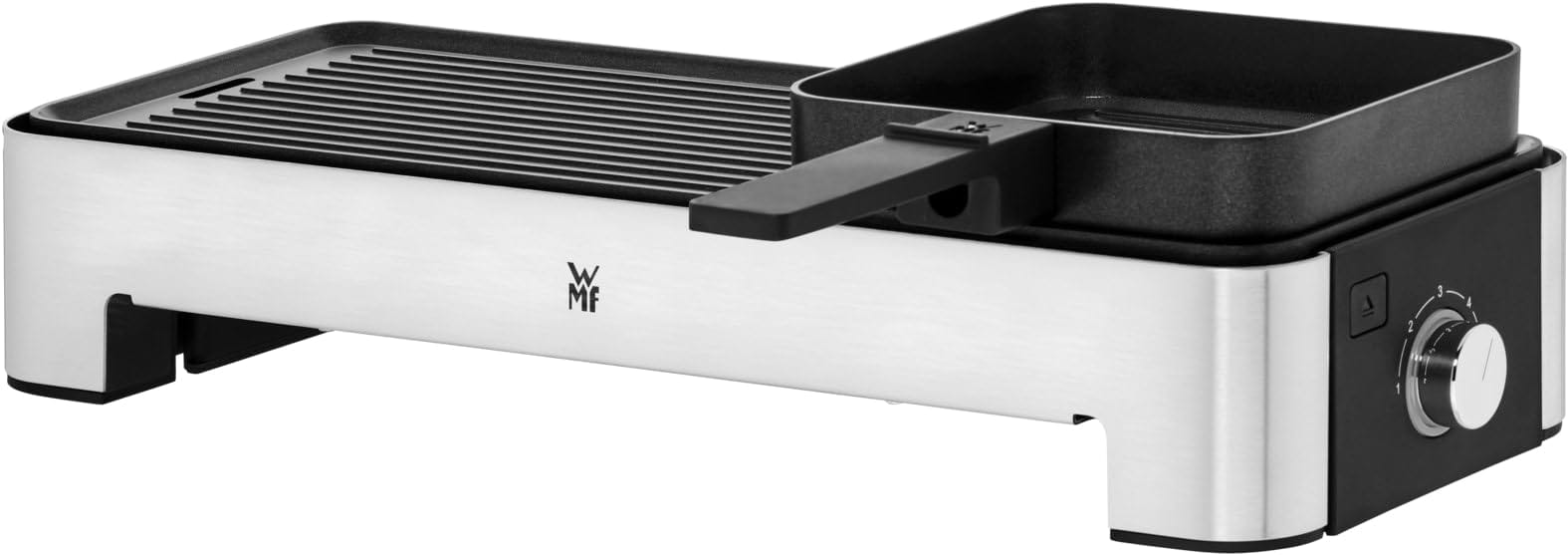 Ten grill stołowy WMF CE jest wyposażony w wiele funkcji, które sprawiają, że grillowanie staje się łatwe i przyjemne. Zawiera on 1x Tischgrill elektro aus Cromargan Edelstahl matt (38 x 14,3 x 9,3 cm, 1000 Watt), 1x Gemüse-Pfännchen antihafbeschichtet – Artikelnummer: 0415170011. Dzięki temu grillowi można przygotować zdrowe i niskotłuszczowe potrawy w domu. Antyadhezyjna powierzchnia grillowa pozwala na przygotowanie potraw bez użycia tłuszczu.