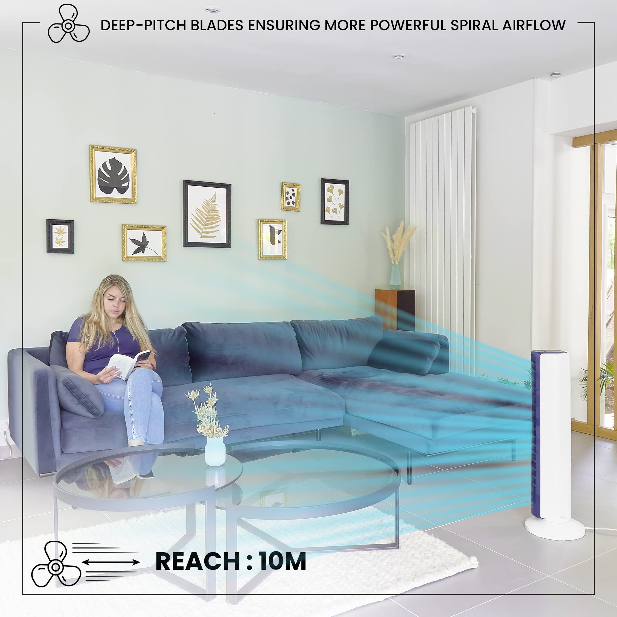 **Wydajność i zasięg**: Zasięg działania wynoszący aż 10 metrów sprawia, że wentylator skutecznie chłodzi większe pomieszczenia, zapewniając równomierny przepływ powietrza. To idealne rozwiązanie do salonu, sypialni czy biura.