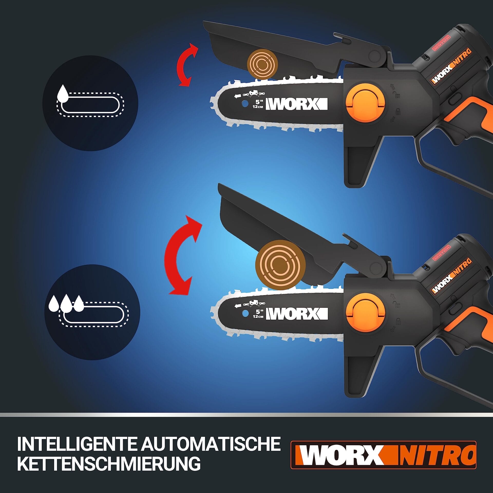 WORX WG325E Nitro profesjonalna mini akumulatorowa piła łańcuchowa 20 V – jednoręczna piła do gałęzi – mocny silnik bezszczotkowy – długość cięcia 12 cm – lekka i kompaktowa – automatyczne smarowanie