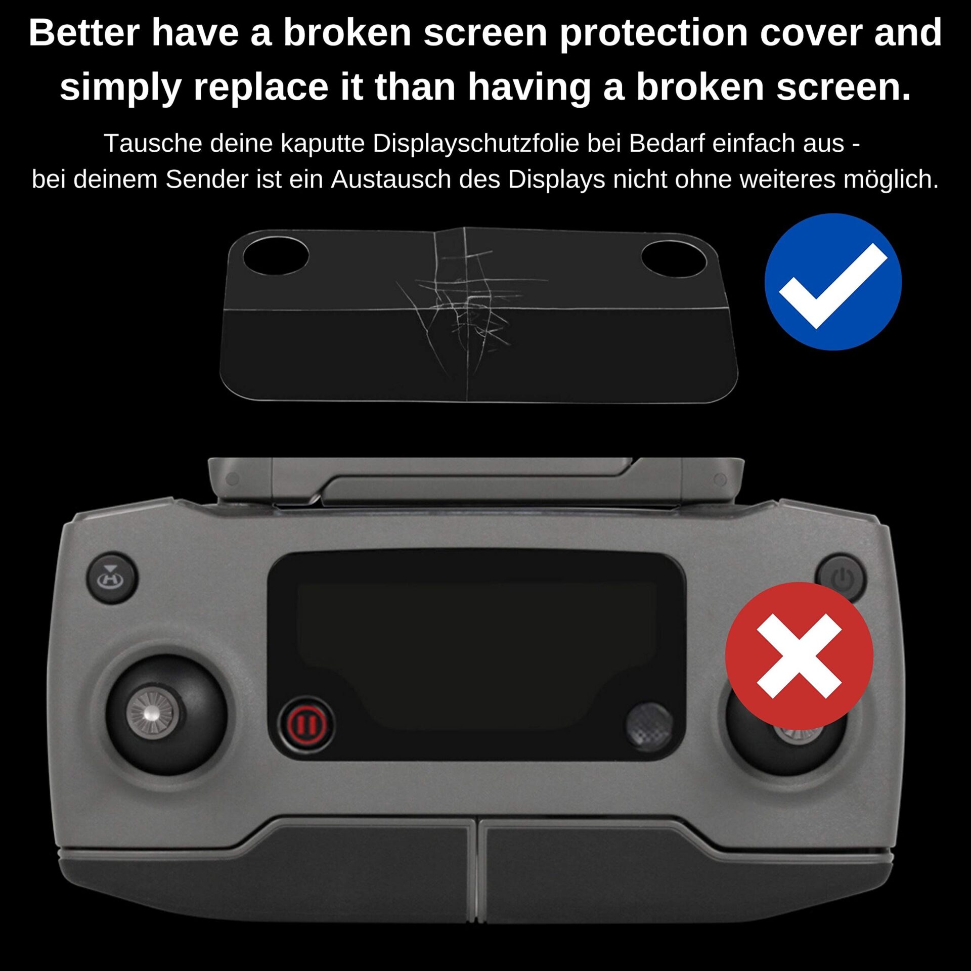 ✅ [Ochrona przed zarysowaniami,: [Ochrona przed zarysowaniami, zabrudzeniami i odciskami palców ] Niezawodnie chroni delikatny wyświetlacz pilota przed zużyciem, kurzem i zadrapaniami – zapewnia dobrą widoczność podczas każdego lotu.