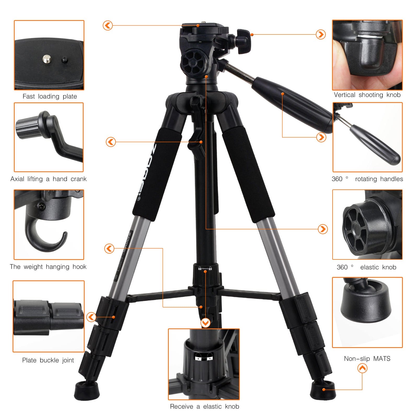Statyw posiada 3-drożną głowicę panelową z płytą szybkozłączną. Trzy przyciski regulacyjne z tłumioną głowicą pozwalają na strzelanie pod dowolnym kątem, zapewniając precyzję i wydajność. Dzięki temu możesz łatwo dostosować ustawienia aparatu lub telefonu, aby uzyskać idealne ujęcie.