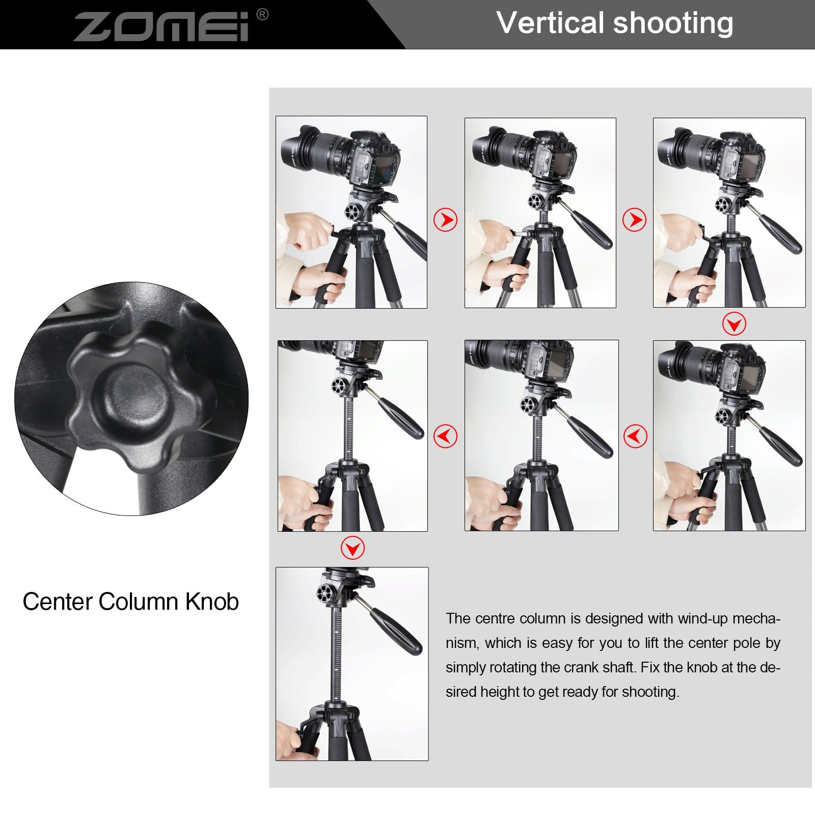 Statyw posiada również 4-częściową nogę kolumnową z szybkim zamkiem, co umożliwia wygodne ustawienie żądanej wysokości podczas fotografowania. Możesz łatwo dostosować wysokość statywu do swoich potrzeb, aby uzyskać najlepsze ujęcia.