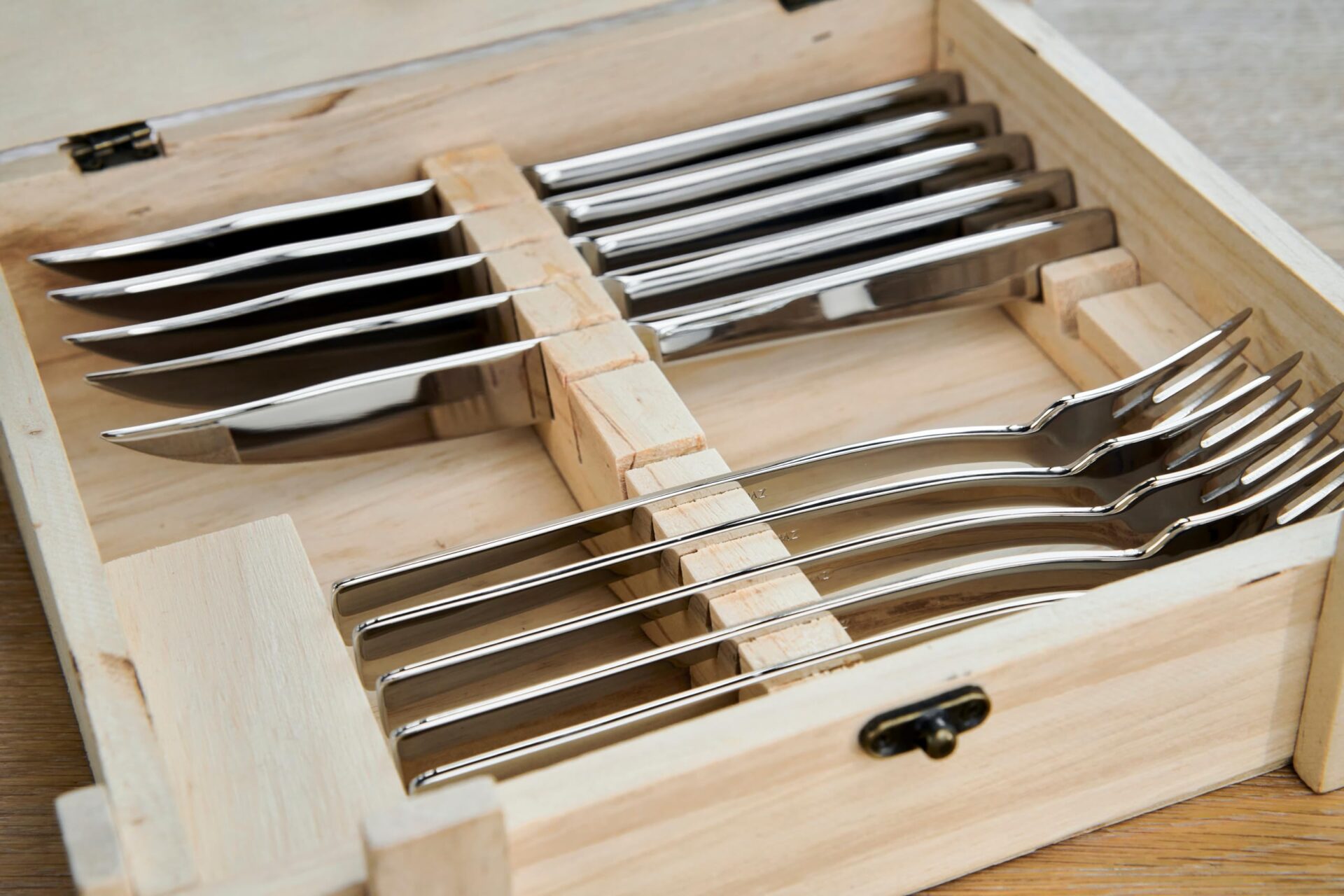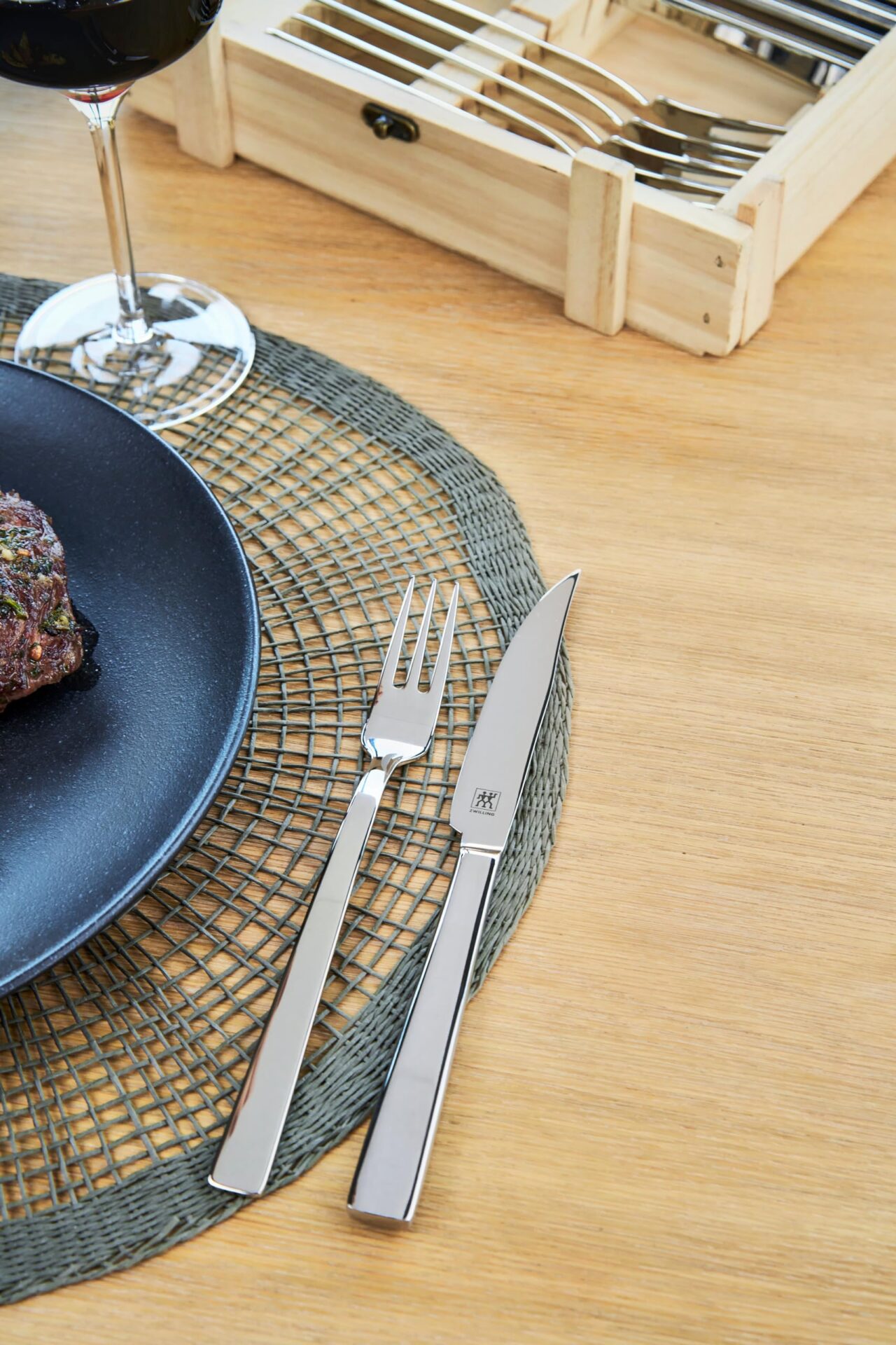Zwilling Steak Besteck Set, 12-teilig Holz-Box, 6 Steakmesser – 6 Steakgabeln, spülmaschinengeeignet, Poliert 18/10 rostfreierEdelstahl